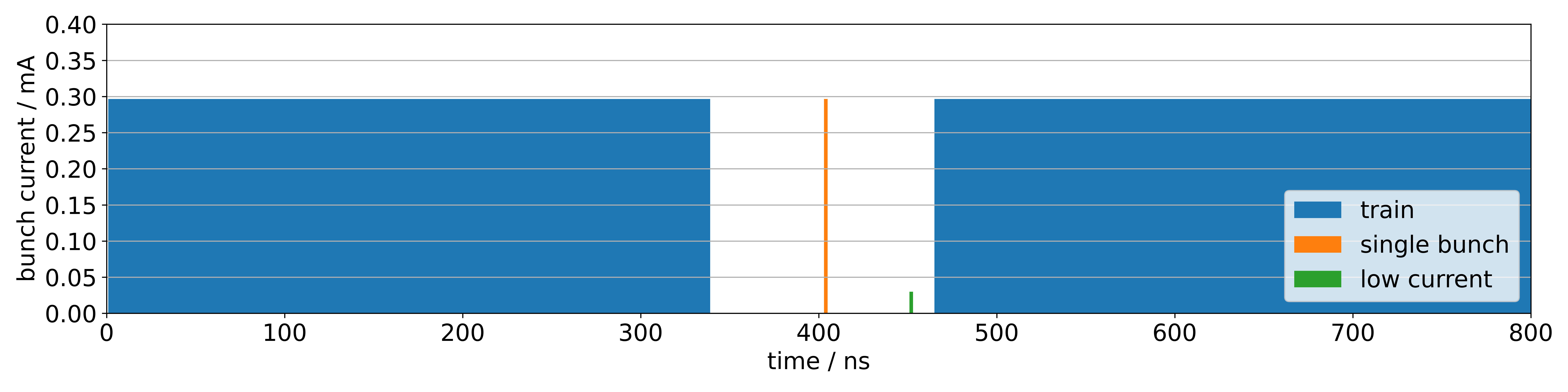 Mode B (default): 100 mA ring current, resulting in 285 μA per bunch; injections at 7am and 3pm. Here, an additional short bunch (≤ 30 µA; approx. 7 ps bunch length FWHM) is added for time-resolved experiments.