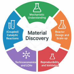 At the core of our research lies a fundamental belief: that the tools of inorganic and materials chemistry hold immense potential to engineer advanced catalysts and catalytic processes essential for a sustainable future. We are driven by the idea that through thoughtful design, we can create catalysts that not only perform exceptionally well but also meet the practical demands of real-world applications. Our goal is to establish a versatile platform of molecularly derived and solid-state catalysts, built on a foundation that integrates synthetic creativity, deep mechanistic understanding, and technological relevance. These catalysts will be designed to operate efficiently under mild, energy-efficient conditions, make use of earth-abundant and non-toxic materials, and remain stable and effective over long operational lifetimes. To achieve this, my research strategy is built on multiple interconnected pillars: catalyst discovery and rational design, integration of coupled catalytic processes, mechanistic understanding through in-situ/operando characterization, reactor and cell design with scale-up for industrial relevance, and technoeconomic and life cycle analysis to evaluate sustainability and cost-effectiveness. A critical component of this framework is a strong emphasis on reproducibility and transparency, ensuring the development of robust, standardized protocols for synthesis and catalysis. Taken together, this integrated approach ensures that catalyst development is guided not only by chemical intuition but also by data-driven insight into scalability, industrial feasibility, and long-term impact, bridging the gap between laboratory and industrial application.