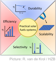 At the Institute for Solar Fuels we develop new materials and devices for the production of chemical fuels from cheap and abundant resources, such as water and CO2, using sunlight. Our current efforts are focused on photo-electrochemical water splitting. Towards this end, we develop deposition processes and synthesis routes for thin film and nanostructured semiconductors and catalysts, and we investigate the fundamental processes of charge generation, separation, and transfer in the bulk and at the interfaces of these materials. Of particular interest is the role of defects, which we aim to control by developing thermal treatments, passivation layers, and doping strategies. Our experimental toolbox includes a range of thin film deposition techniques, electrochemistry and photo-electrochemistry, time-resolved spectroscopy on fs – s time scales, and synchrotron-based methods under operando conditions.