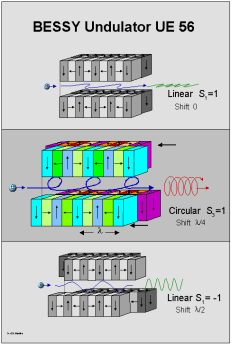 A type of undulator is the Advanced Planar Polarized Light Emitting (APPLE) Undulator such as the UE 56. The diagram shows linear polarization without any shift, meaning the magnetic fields are aligned in a way that produces horizontally polarized light (top). The middle section represents the circular polarization mode, where the magnetic fields are shifted by a quarter period. This creates equal amplitudes for both the horizontal and vertical magnetic fields, resulting in circularly polarized light. The bottom section displays the linear mode again, but this time with a half-period shift of the magnetic structure, producing linearly polarized light at an azimuthal angle due to the 90° phase difference between horizontal and vertical magnetic fields.