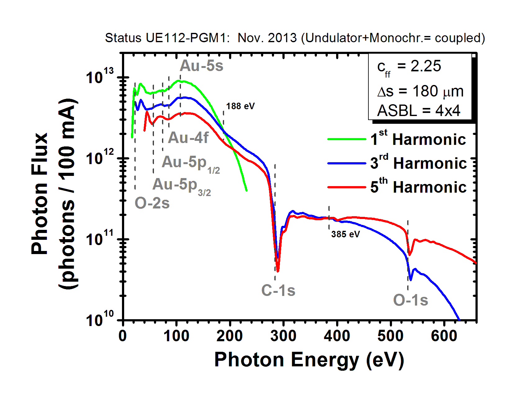 | Flux | > 2x1012 ph/s (20-280eV) ca. 4x1013 ph/s (50-150eV) (standard grating) |