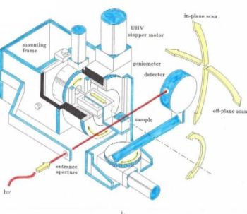 The Small Reflectometer is equipped with 3 UHV-compatible goniometers (Huber 408 and 410) and UHV stepper motors (Phytron) for varying the incidence angle at the sample and for positioning the detector in plane or out of plane. The reflection plane is vertical (i.e. in general s-polarisation geometry).
