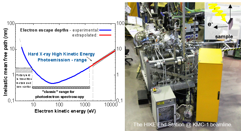 The HiKE endstation is installed at the KMC-1 beamline. Typical experiments running on the HiKE endstation are investigations of bulk samples, multilayers and heterostructures where core levels and valence band are recorded, buried interfaces are accessed and spatially resolved chemical information by x-ray standing waves is recorded. In addition to HAXPES experiments the station also provides parallel access to the sample drain current (TEY) and the signal from a fluorescence detector (FY) thus enabling absorption experiments: XANES and EXAFS.