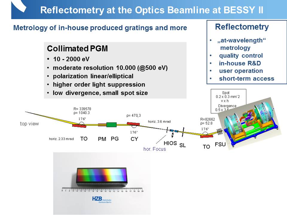 This versatile 11 axes UHV-reflectometer is located at the Optics Beamline, delivering UV and XUV radiation. The soft x-ray bending magnet beamline is equipped with a Plane Grating Monochromator operated in collimated light (collimated PGM). It uses the SX700-1 monochromator equipped with two diffraction gratings 150l/mm for low and 1200 l/mm for high energy ranges. The beamline is optimised for operation with moderate energy resolution but at very high specular purity and efficient stray light reduction provided by a 4-mirror High order suppressor (HIOS), a Filter and Slit Unit (FSU) and additional system of adjustable apertures over the beamline.