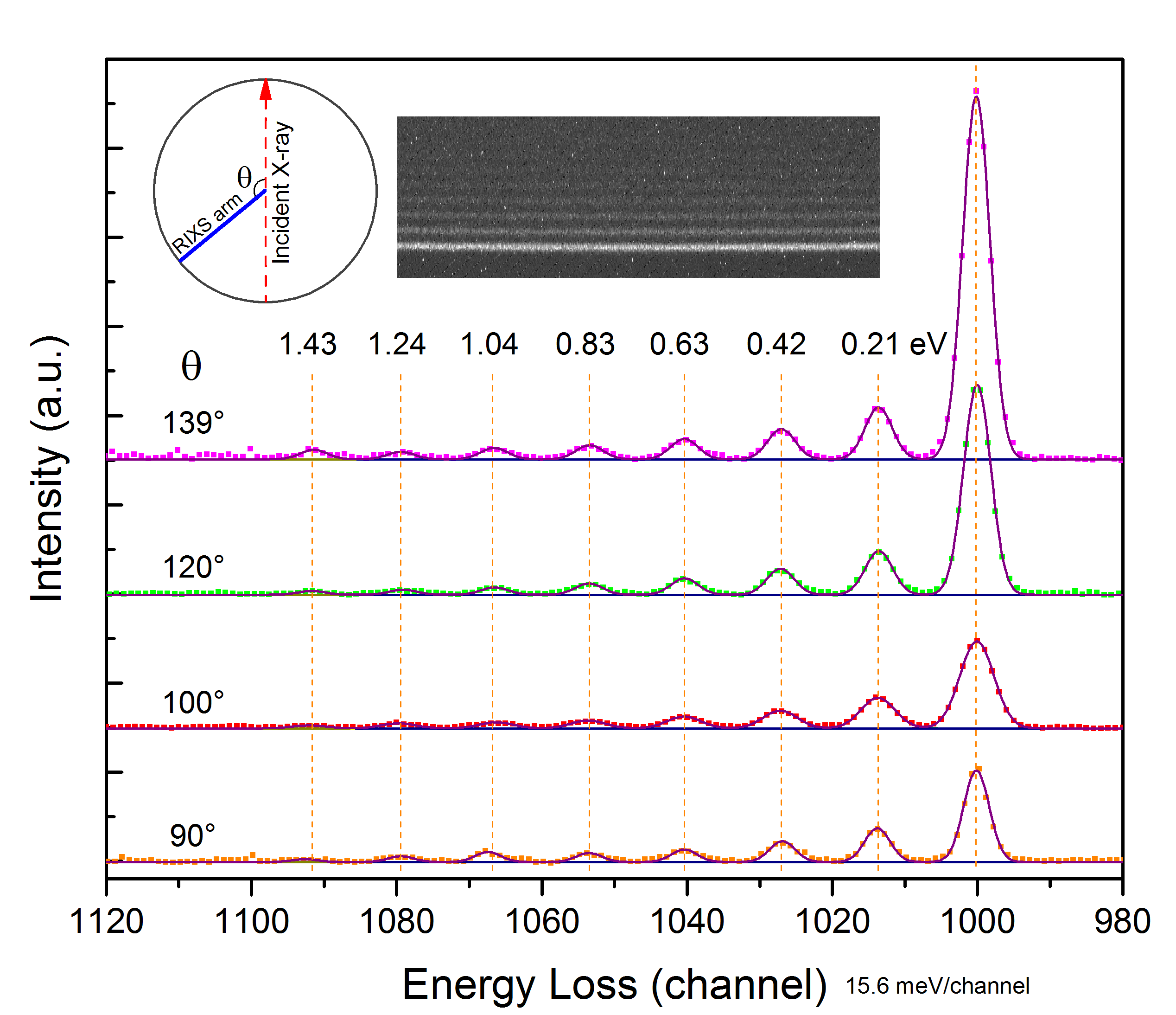 The instrument PEAXIS (PhotoElectron Analysis and X-ray Inelastic Spectroscopy) is located at the U41-PEAXIS beamline, which is one of the highest flux beamlines at BESSY II and provides highly focused soft X-rays, thanks to the ellipsoidal refocusing mirror. The instrument is dedicated to studies of angle-resolved RIXS (Resonant Inelastic X-ray Scattering) and PES (PhotoElectron Spectroscopy) on solids. As shown in the Schematic figure below, the station is equipped with an electron energy analyzer (violet) and a RIXS spectrometer (blue). Various sample manipulators (red) can be installed in the sample chamber (green). The RIXS arm is continuously rotatable on a supporting rail in a range of 106 degrees.